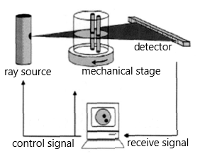 輻射檢測服務器作為工業CT的基礎。當準直的能量束I0穿過物體時,每個體積元素在每個透射方向上的衰減系數μi不同。結果,檢測器接收的發射能量I也不同。根據一定的圖像重建算法,可以得到被檢工件截面的較薄部分,沒有圖像重疊(圖1),通過重復上述過程可以獲得新的斷層圖像。當測量足夠的二維斷層圖像時,可以重建三維圖像。