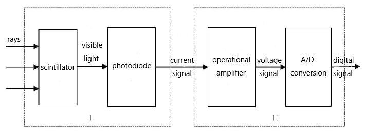 從閃爍探測器的結構描述中可以看出,其工作原理如下:當射線進入閃爍器時,在某個點產生二次電子,該二次電子使閃爍器的分子或原子電離并激發。在去激勵中發出大量光子。由于閃爍體周圍的反射層的作用,大部分熒光通過光耦合劑或光導到達光電二極管的光敏表面。光電二極管將光信號轉換為電流信號,然后通過后續電路將其轉換和放大,以輸出可以測量的電壓信號。綜上所述,閃爍探測器的工作過程可以分為以下幾個階段: