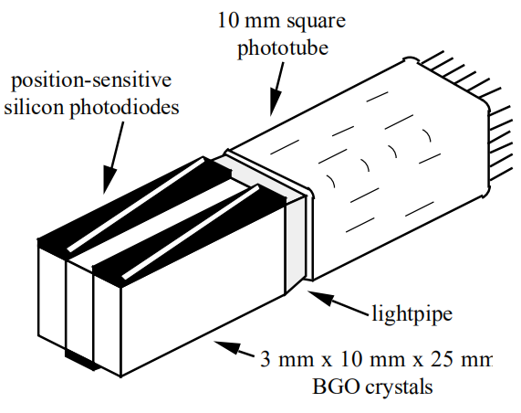 圖示了一種由三個或三個以上的光學隔離BGO晶體組成的探測器,該晶體連接在一個10 mm的方形光電倍增管上,該光電倍增管為該組提供一個快速定時脈沖。每個晶體還單獨耦合到位置敏感光電二極管,該光電二極管識別阻止湮滅光子的晶體并確定相互作用的深度。