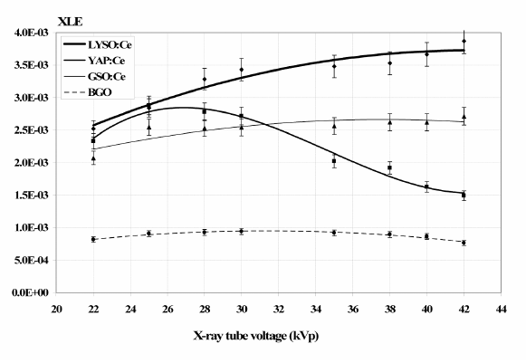 The x-ray luminescence efficieny (XLE) of Ce:LYSO, Ce:YAP, Ce:GSO and BGO as determined by the experimental data for x-ray tube voltages between 50–140 kVp (general radiography).Points: measured data, line: fitted curve.